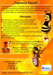 Nie czekaj i zadzwoń aby umówić termin! Pamiętaj, że zajęcia prowadzimy poza sezonem pszczelarskim, gdy nie musimy być w naszych pasiekach. Więcej informacji na naszym plakacie lub pod numerem telefonu 503050844